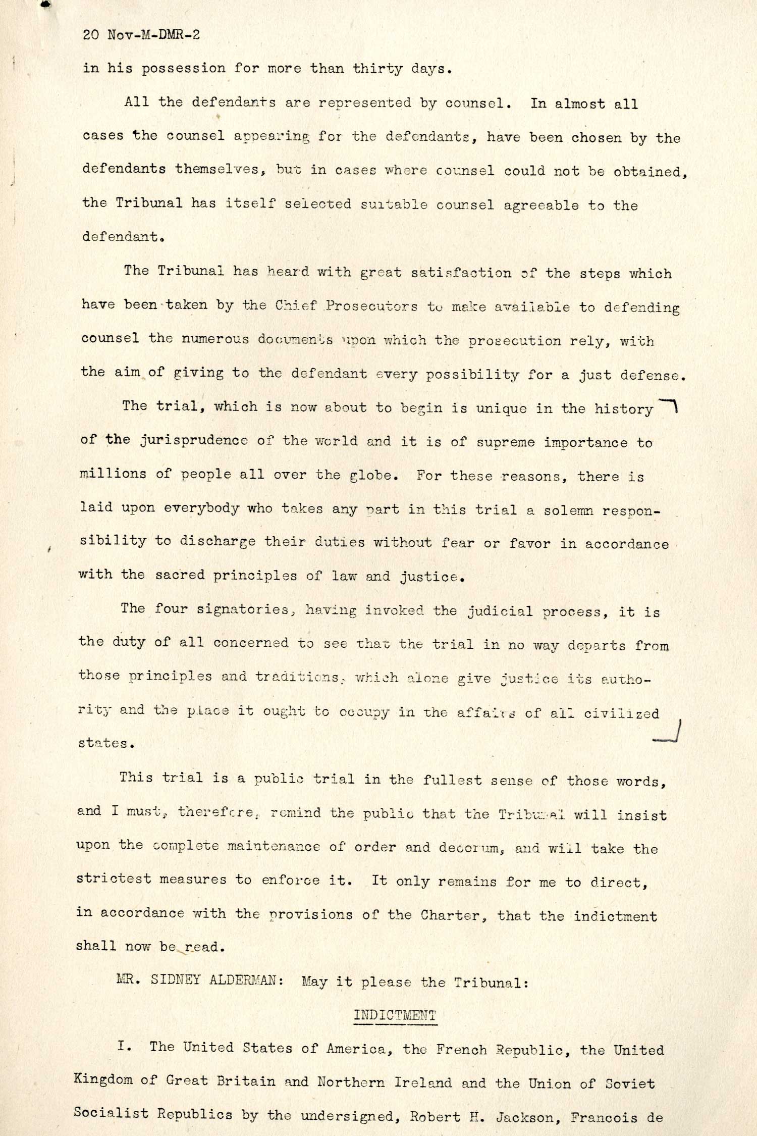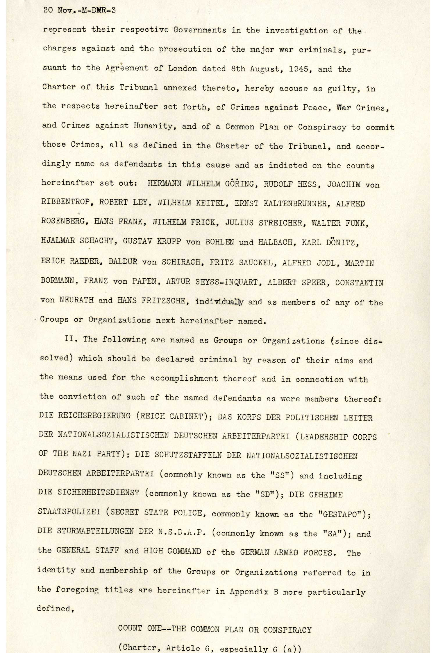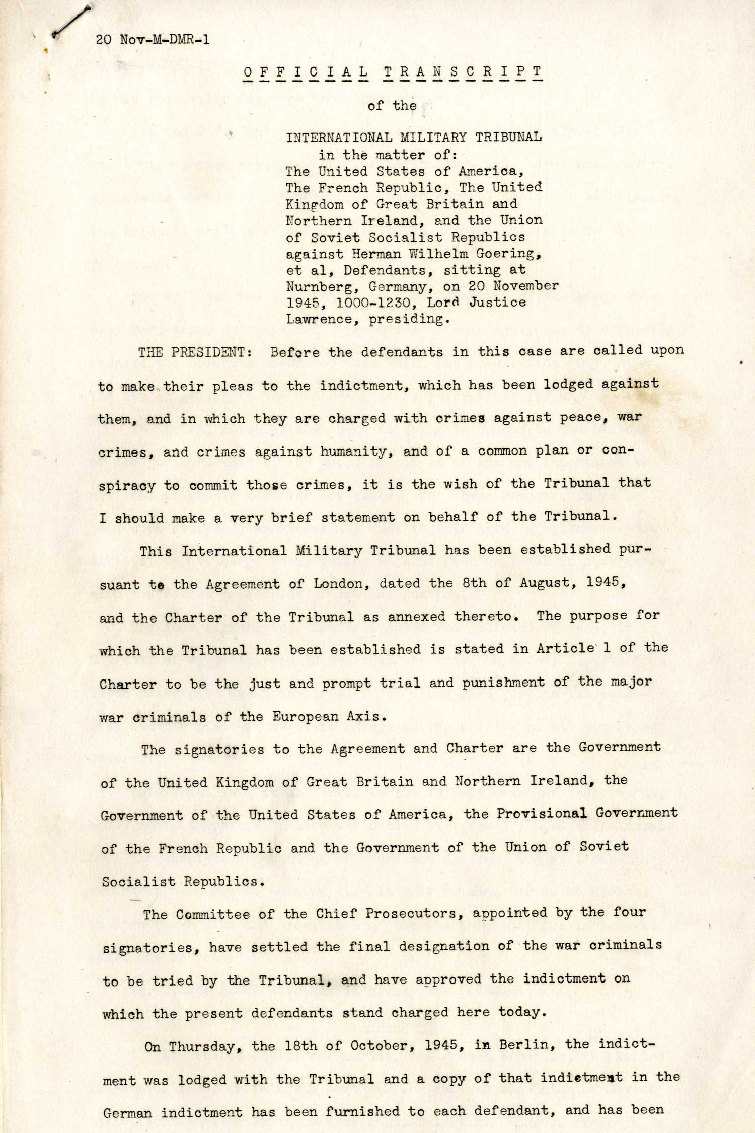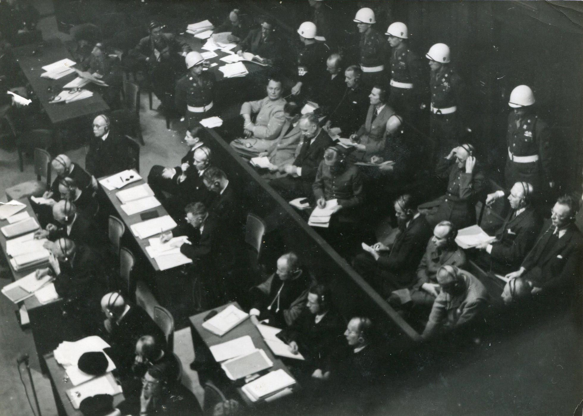 V srpnu 1945 byl v Londýně ustanoven Mezinárodní vojenský tribunál, v němž zasedli zástupci vítězných mocností, tedy USA, Velké Británie, Francie a SSSR. Místem jeho konání měl být německý Norimberk, bombardováním zničené město, v němž probíhaly sjezdy NSDAP. K zahájení prvního soudního procesu v Justičním paláci došlo 20. listopadu 1945. Jednalo se o soud s 24 hlavními válečnými zločinci, jako byli Martin Bormann, Hermann Göring, Rudolf Hess, Joachim von Ribbentrop, Wilhelm Keitel, Ernst Kaltenbrunner či Fritz Sauckel, ale také Konstantin von Neurath a Wilhelm Frick. Obžalováno bylo zároveň 6 zločineckých organizací. Celý proces trval až do 1. října 1946 a skončil trestem smrti pro polovinu obviněných osob.