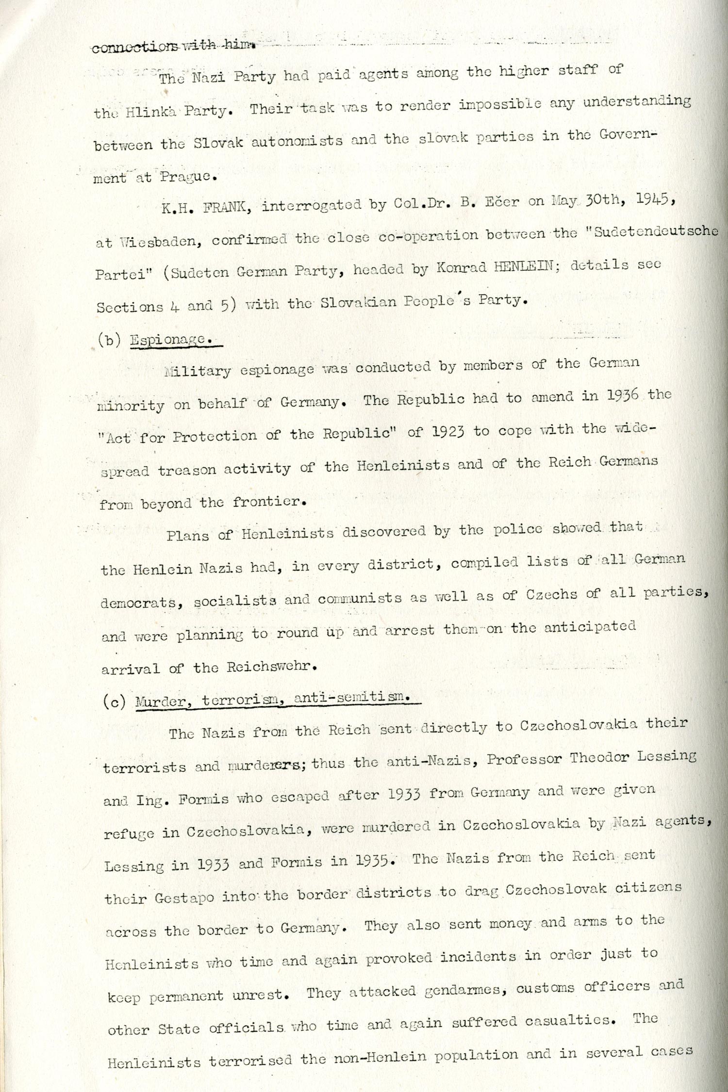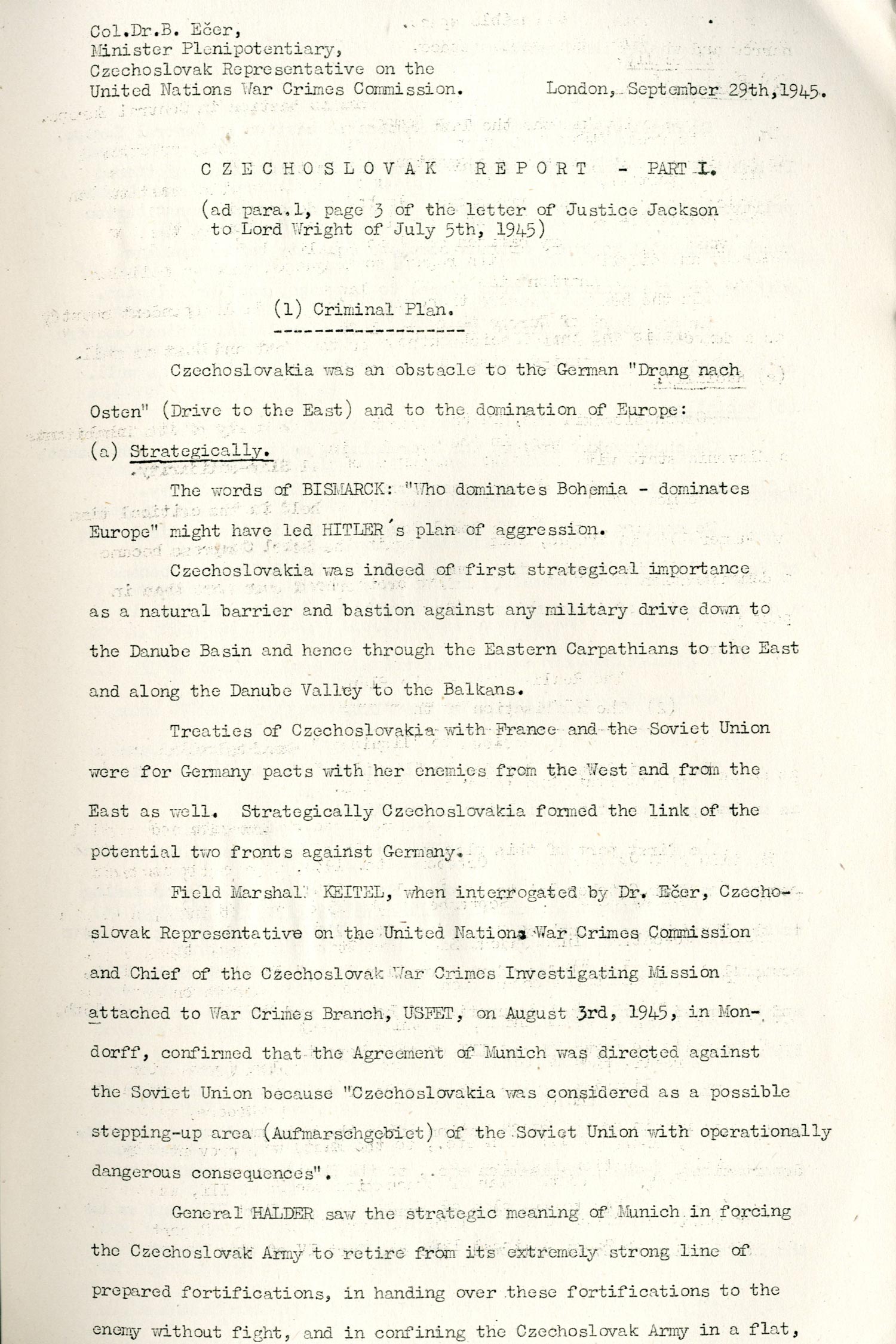 Již v říjnu 1942 byla zřízena Komise Spojených národů pro stíhání válečných zločinů, která měla připravovat a shromažďovat materiály k masovým zločinům nacistického Německa. Československo bylo v této komisi zastoupeno plukovníkem Bohuslavem Ečerem, jehož úkolem bylo mj. předkládat komisi žaloby proti válečným zločincům a žádosti o zapsání osob na seznam válečných zločinců. Od jara 1945 pak zastupoval Československo při mezinárodních jednáních o stíhání válečných zločinců.