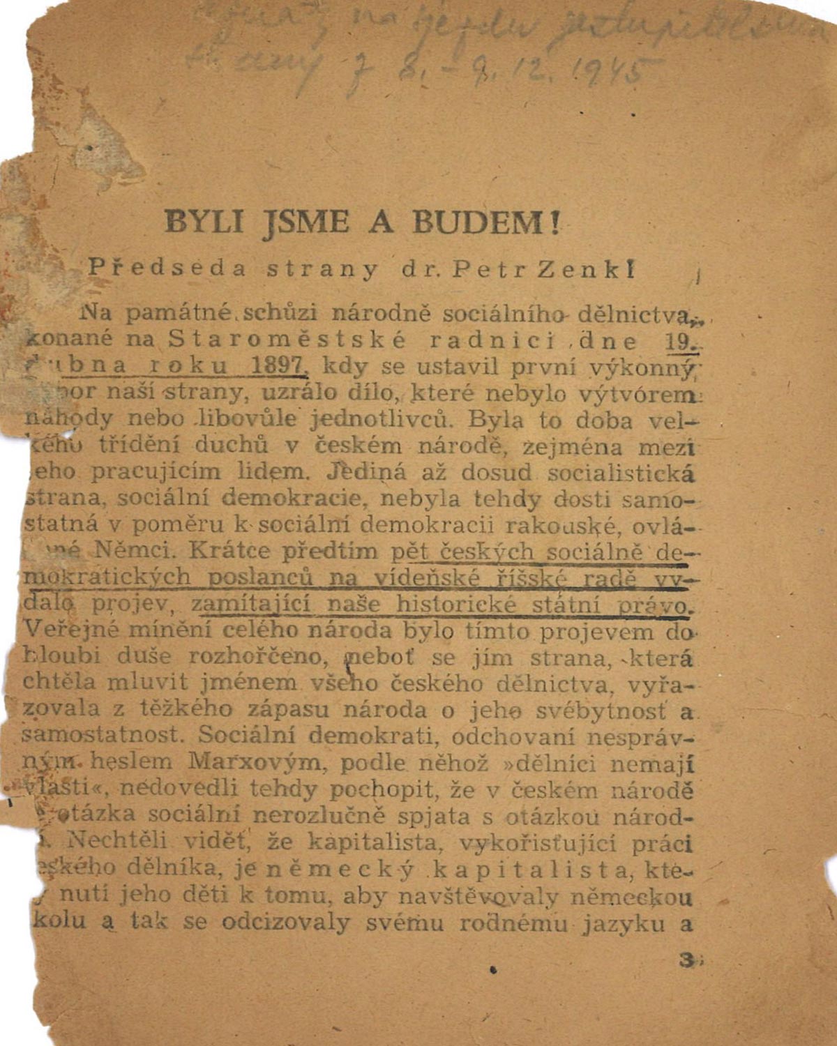 Petr Zenkl (*13. 6. 1884 Tábor – † 3. 11. 1975 Raleigh, USA) byl zvolen předsedou ČSNS krátce po osvobození v Buchenwaldu. Na základě koaliční dohody Národní fronty z 27. srpna 1945 stanul v čele Ústředního národního výboru hlavního města Prahy. Jeho primátorské období probíhalo ve znamení denacifikačních a protiněmeckých opatření a svůj postoj si postupně vyhraňoval i vůči KSČ. Po volbách v květnu 1946 se stal prvním místopředsedou nové Gottwaldovy vlády. Před převratem, 20. února 1948, byl iniciátorem demise dvanácti nekomunistických ministrů. Po ztroskotání pokusu o zvrat prosovětské orientace země emigroval do USA, kde se stal 25. února 1949 spoluzakladatelem a předsedou Rady svobodného Československa, v jejímž čele stál až do své smrti.