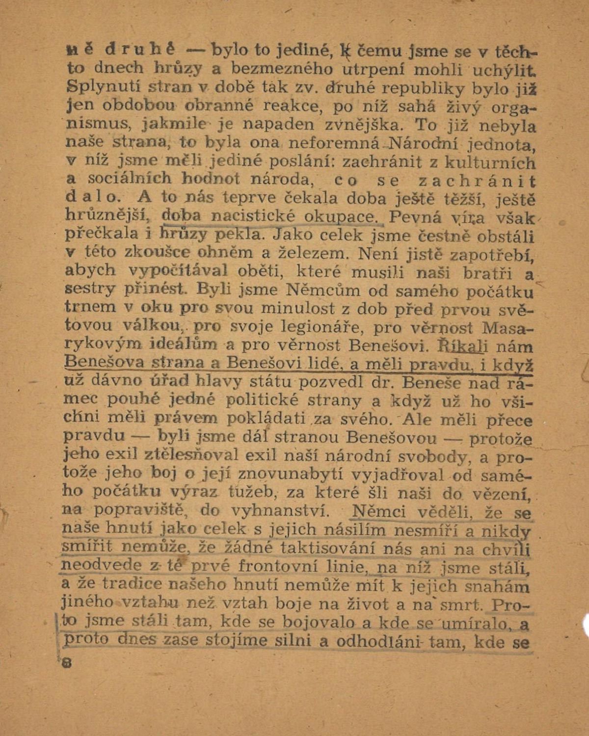 Revoluční výbor Československé strany národně socialistické (ČSNS) zvolil již 25. dubna 1945 na svém tajném zasedání předsedou Petra Zenkla. Strana obnovila vnitrostranickou strukturu a v době sjezdu, na konci roku 1945, již sdružovala asi 450 000 členů. Jednalo se zejména o státní zaměstnance, podnikatele, obchodníky a živnostníky. Ubyla velká část dělnictva a zaměstnanců z větších závodů. Ve volbách v květnu 1946 získala ČSNS 23,66 % hlasů a stala se po KSČ druhou nejsilnější parlamentní stranou. Někteří funkcionáři se však později rozhodli spolupracovat s komunisty a při převratu v únoru 1948 se postavili na jejich stranu. Po následném vyloučení demokratických představitelů vznikla Československá strana socialistická úzce spolupracující s novým režimem.