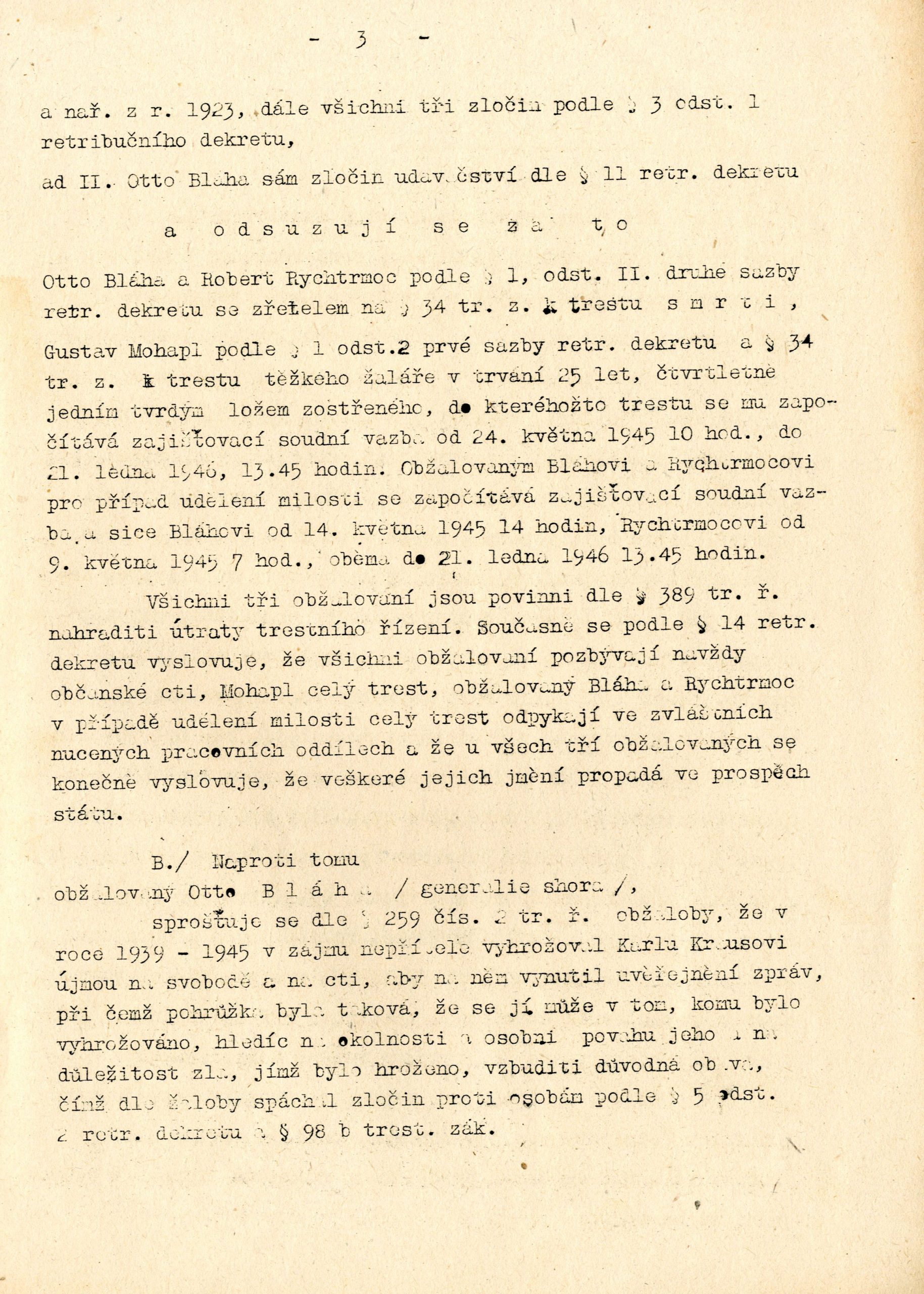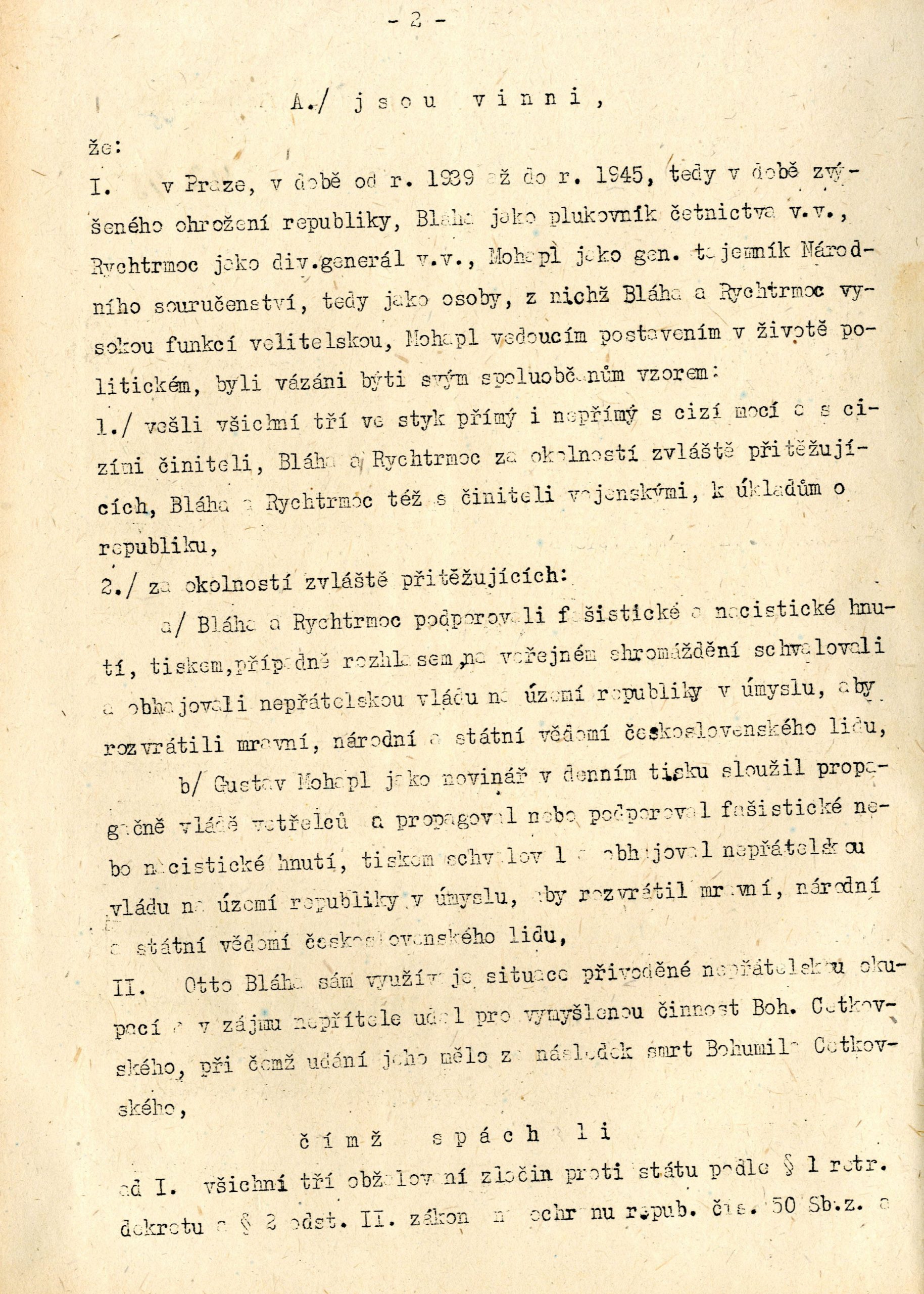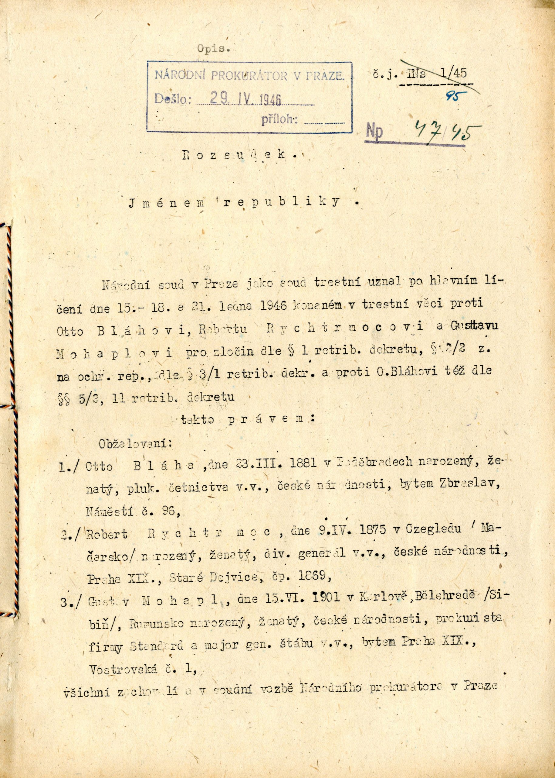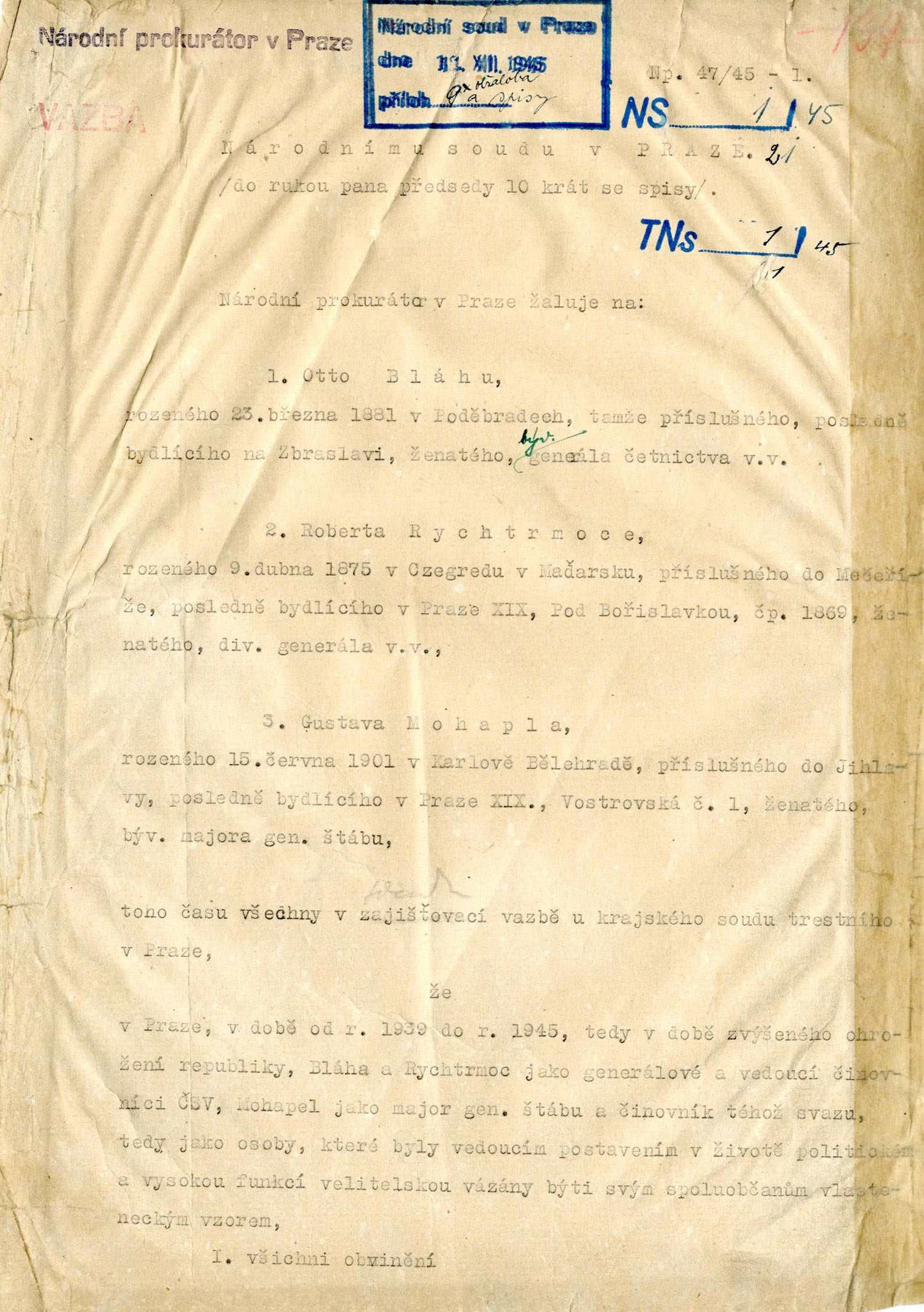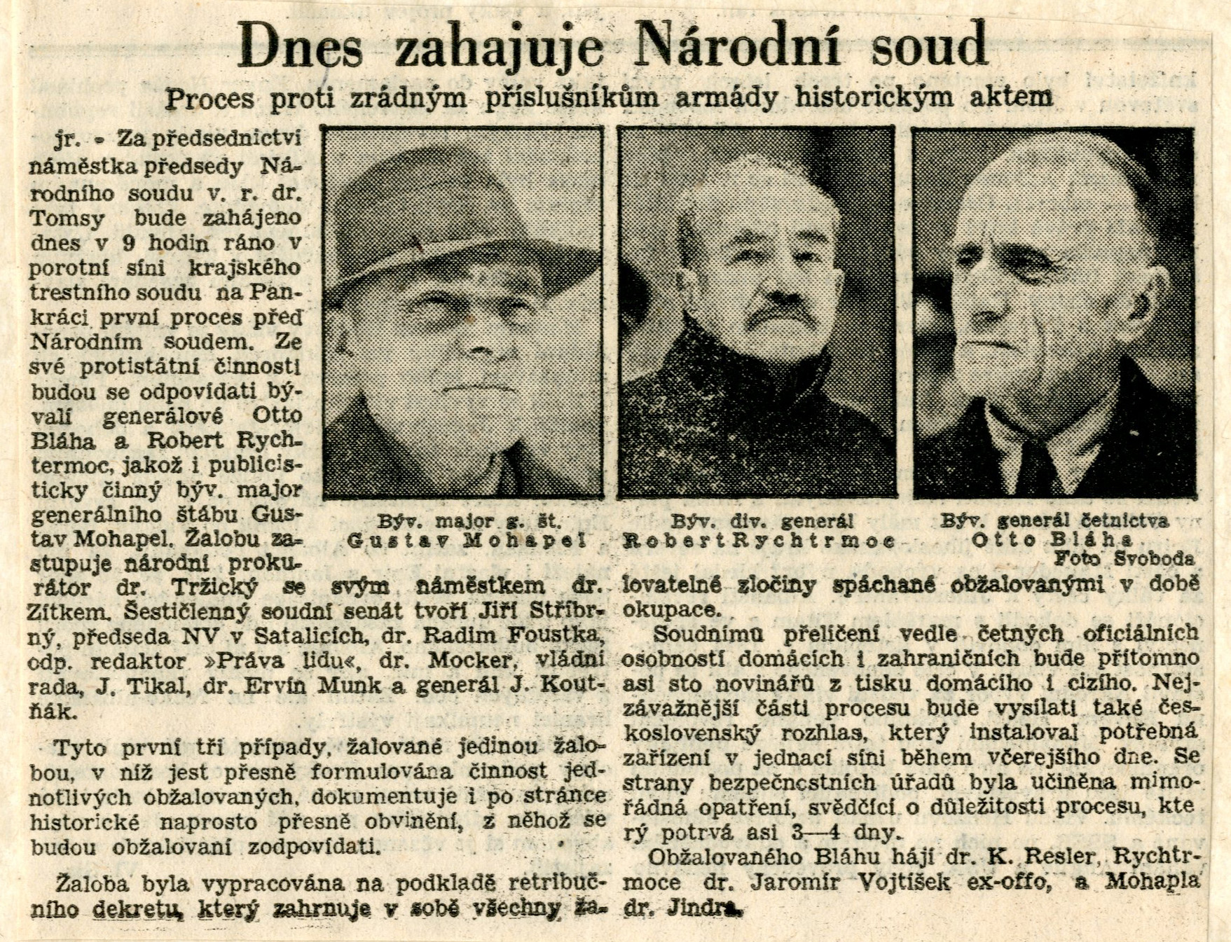 První žaloba národního prokurátora byla podána 11. prosince 1945 na bývalé čs. důstojníky Ottu Bláhu, Roberta Rychtrmoce a Gustava Mohapla za podporu a propagaci fašismu a nacistického hnutí, zejména v souvislosti s jejich aktivitami v rámci Českého svazu válečníků. Soudní proces se konal za velké pozornosti médií ve dnech 15. až 21. ledna 1946 v Justičním paláci v Praze na Pankráci. Oba vedoucí uvedeného svazu, O. Bláha a R. Rychtrmoc, byli odsouzeni k trestu smrti, G. Mohapl k 25 letům těžkého žaláře, všichni tři ke ztrátě občanské cti a propadnutí majetku ve prospěch státu.