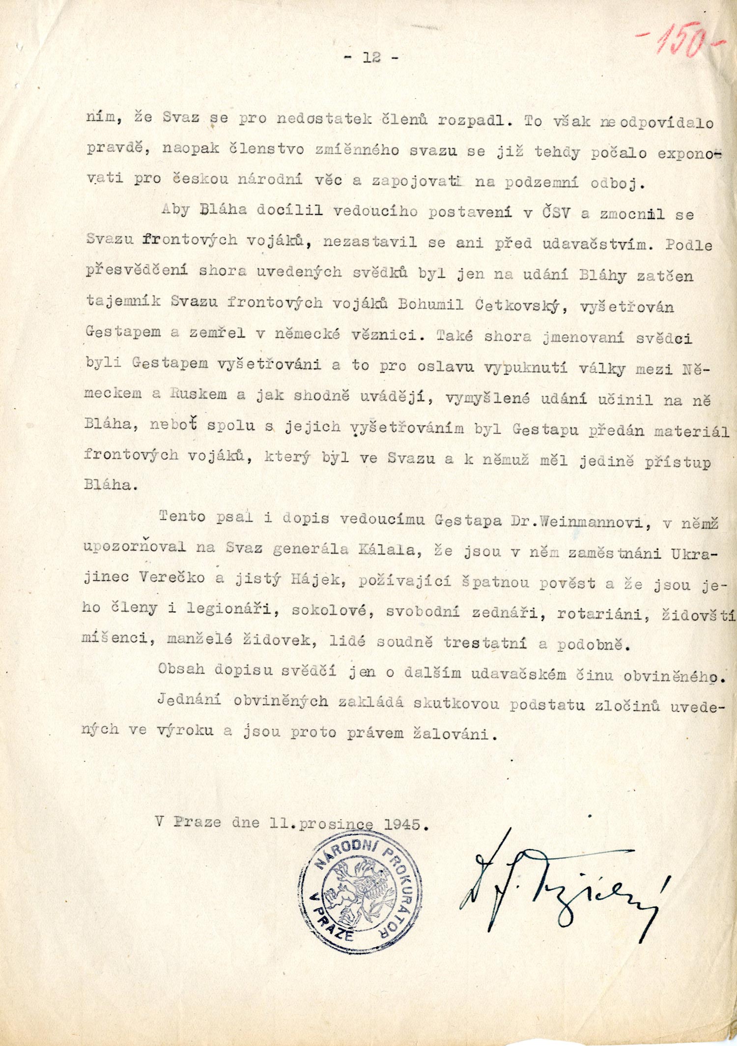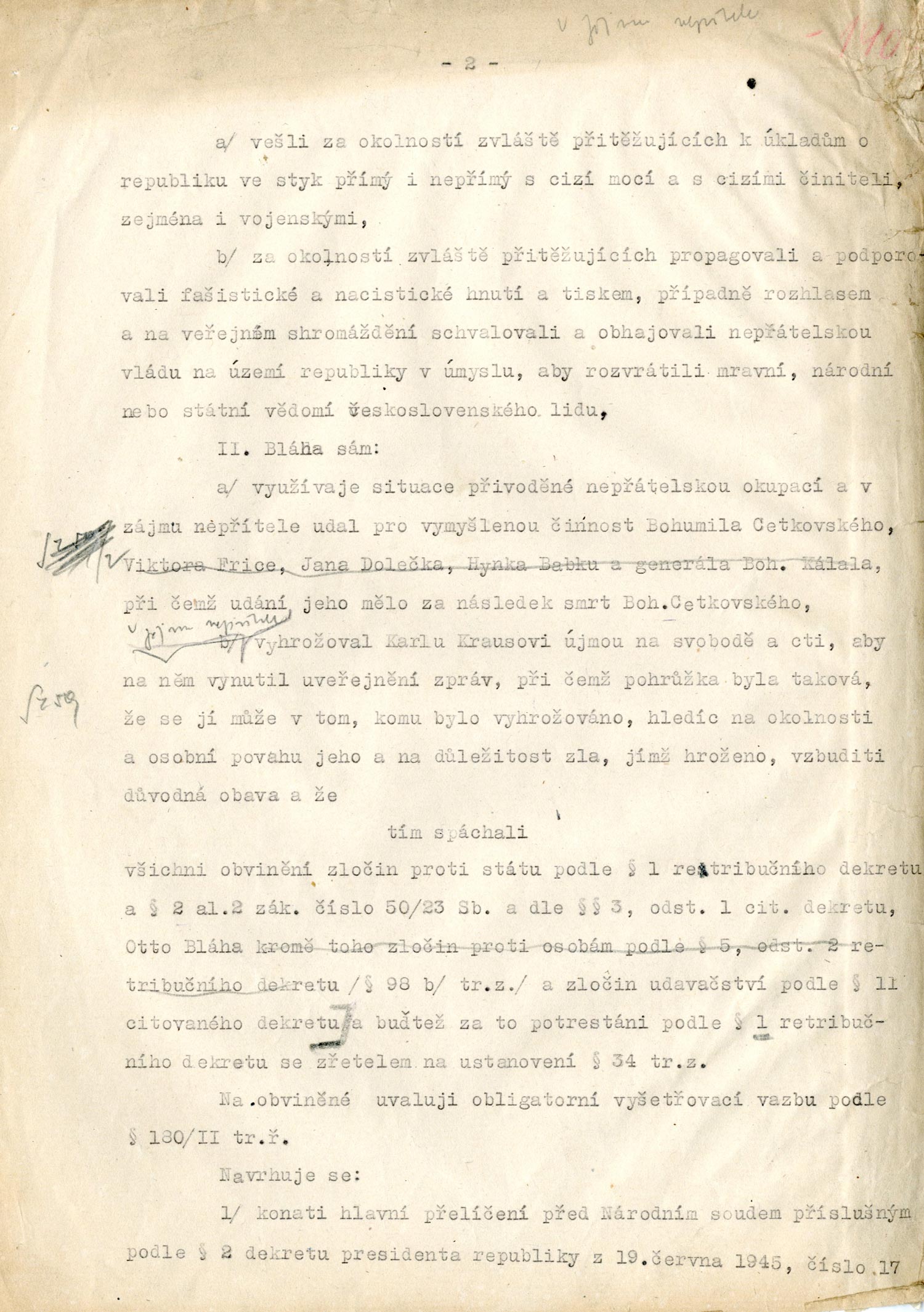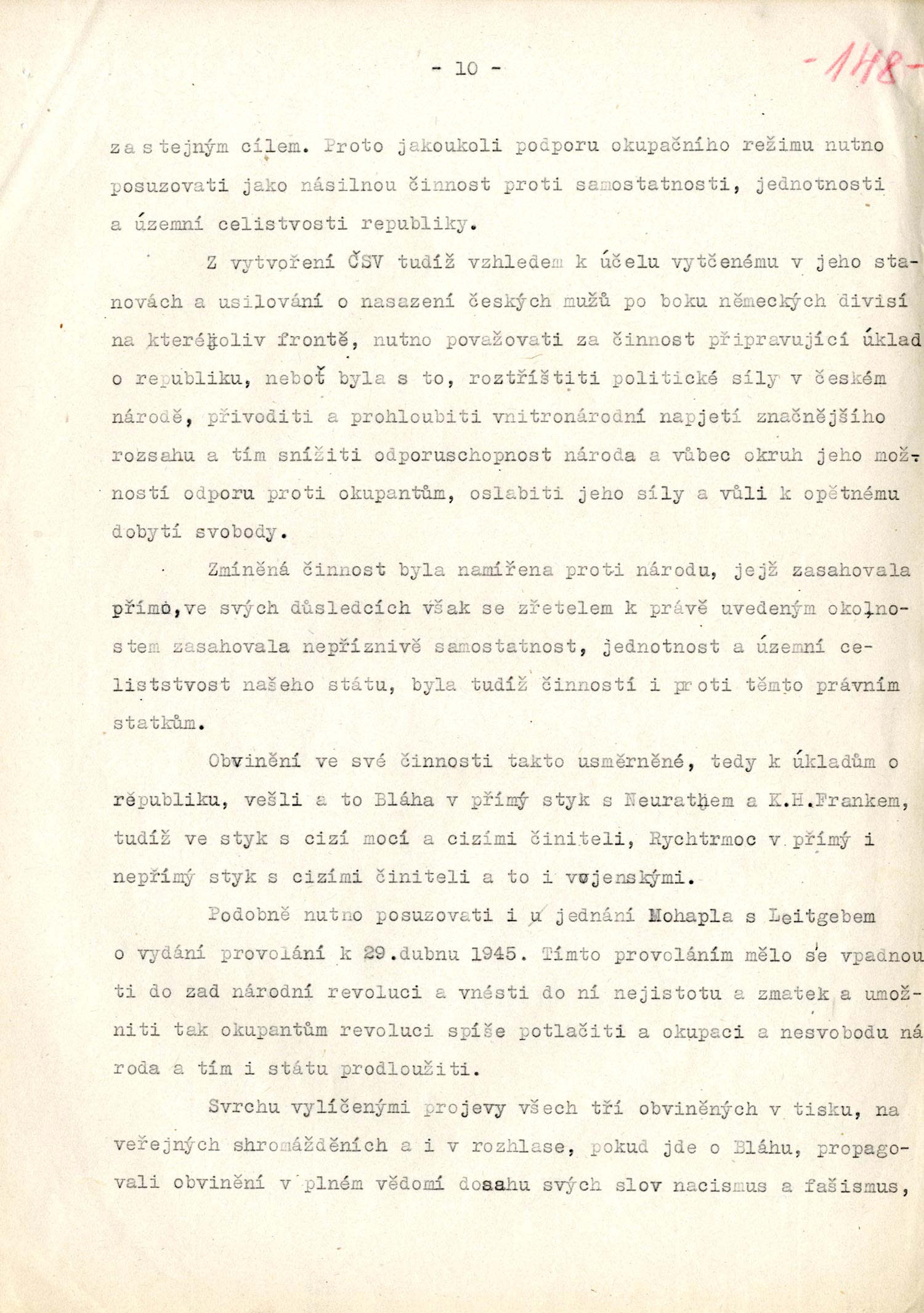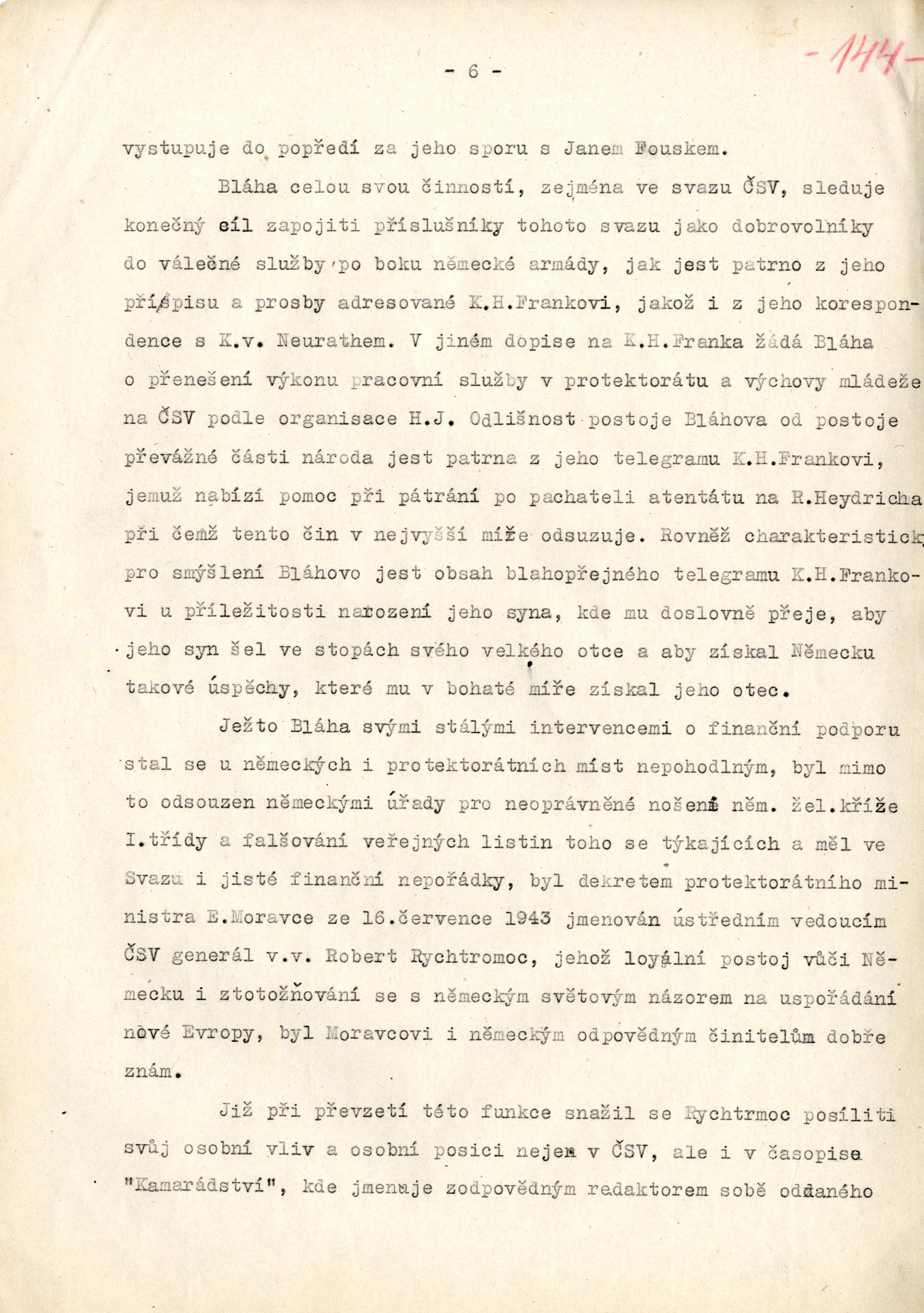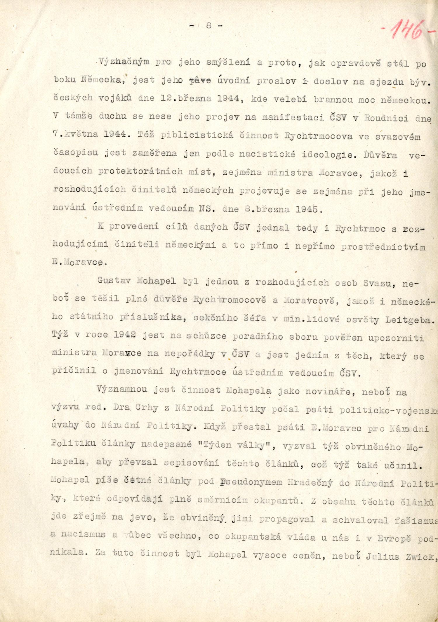 První žaloba národního prokurátora byla podána 11. prosince 1945 na bývalé čs. důstojníky Ottu Bláhu, Roberta Rychtrmoce a Gustava Mohapla za podporu a propagaci fašismu a nacistického hnutí, zejména v souvislosti s jejich aktivitami v rámci Českého svazu válečníků. Soudní proces se konal za velké pozornosti médií ve dnech 15. až 21. ledna 1946 v Justičním paláci v Praze na Pankráci. Oba vedoucí uvedeného svazu, O. Bláha a R. Rychtrmoc, byli odsouzeni k trestu smrti, G. Mohapl k 25 letům těžkého žaláře, všichni tři ke ztrátě občanské cti a propadnutí majetku ve prospěch státu.
