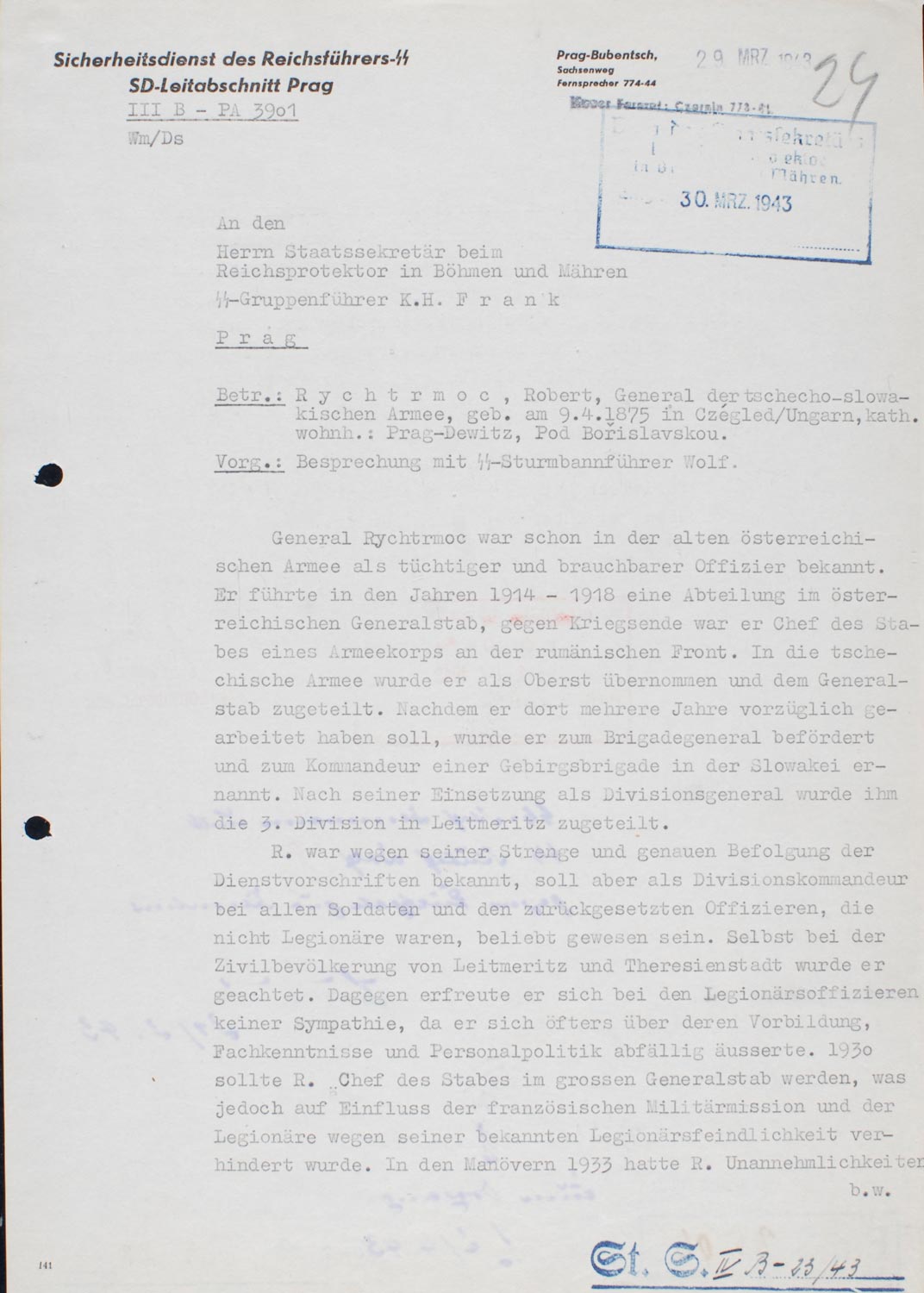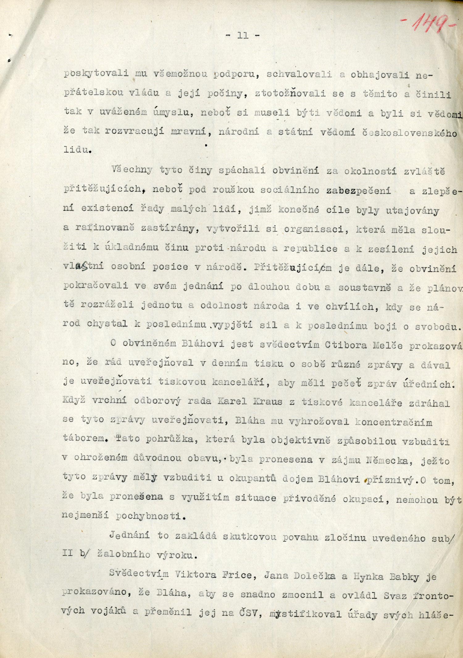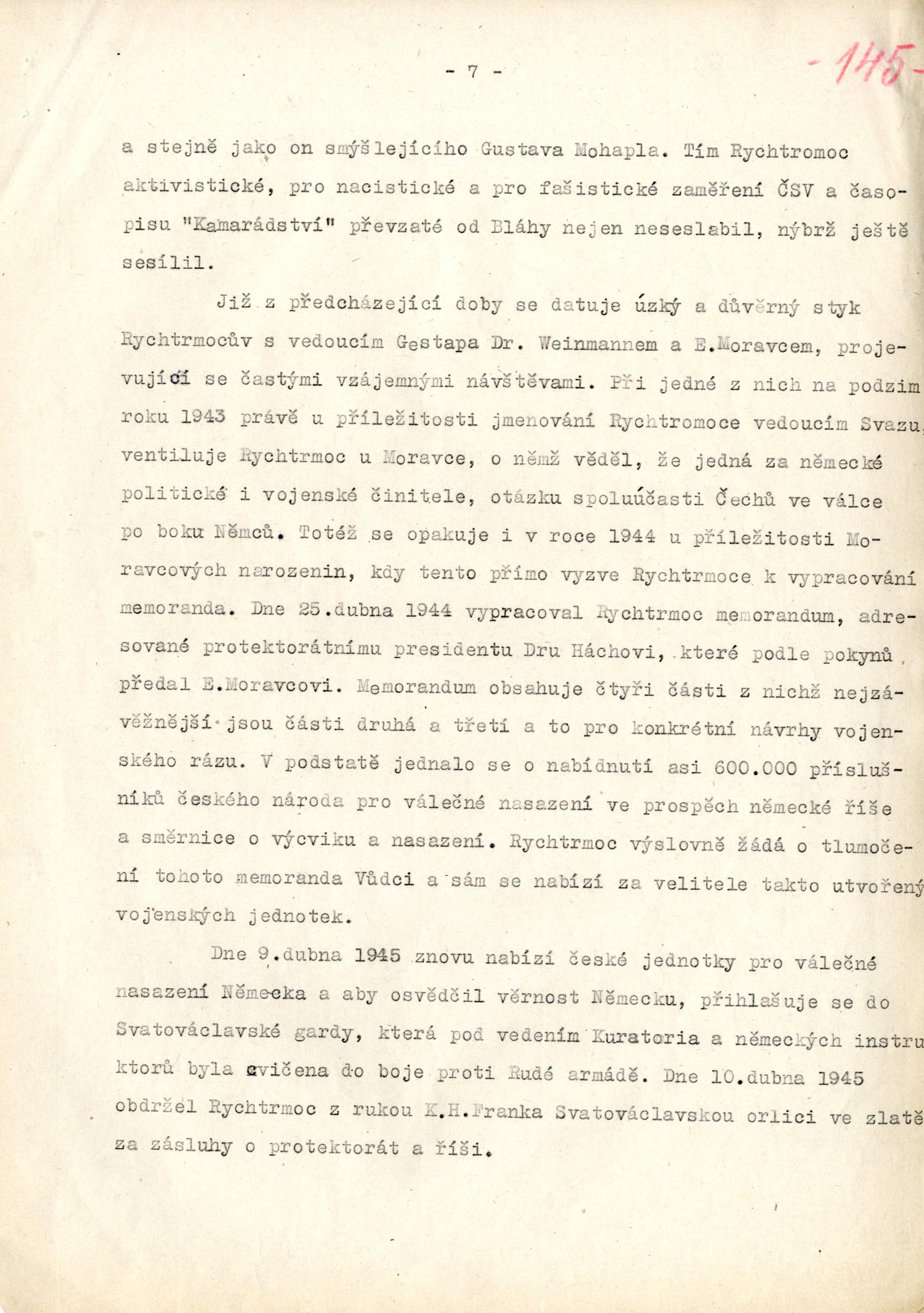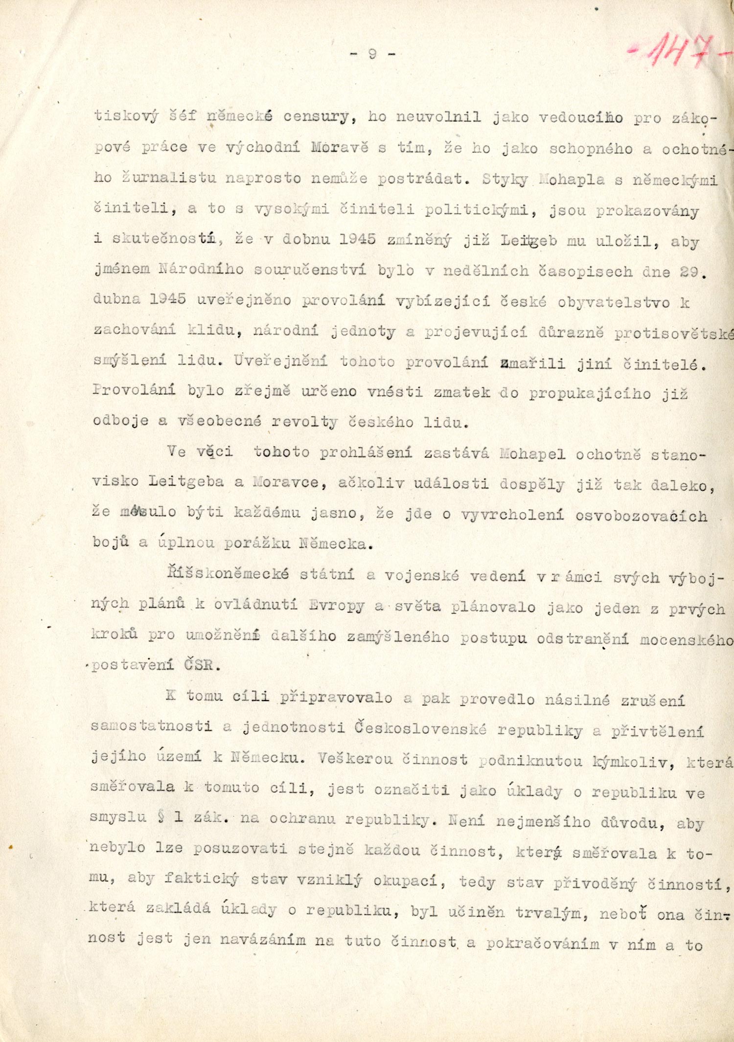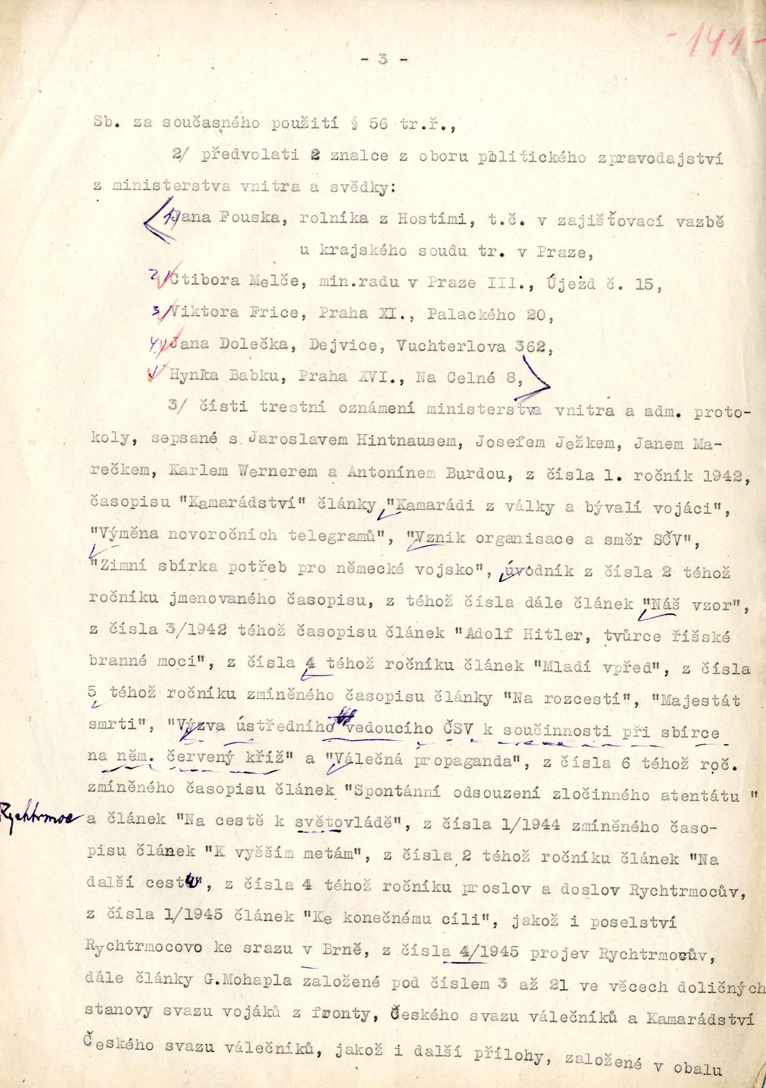 První žaloba národního prokurátora byla podána 11. prosince 1945 na bývalé čs. důstojníky Ottu Bláhu, Roberta Rychtrmoce a Gustava Mohapla za podporu a propagaci fašismu a nacistického hnutí, zejména v souvislosti s jejich aktivitami v rámci Českého svazu válečníků. Soudní proces se konal za velké pozornosti médií ve dnech 15. až 21. ledna 1946 v Justičním paláci v Praze na Pankráci. Oba vedoucí uvedeného svazu, O. Bláha a R. Rychtrmoc, byli odsouzeni k trestu smrti, G. Mohapl k 25 letům těžkého žaláře, všichni tři ke ztrátě občanské cti a propadnutí majetku ve prospěch státu.