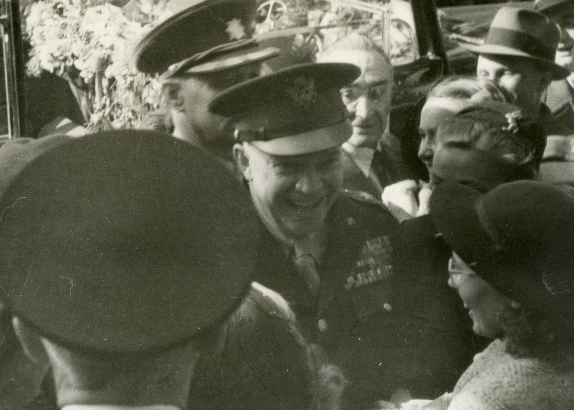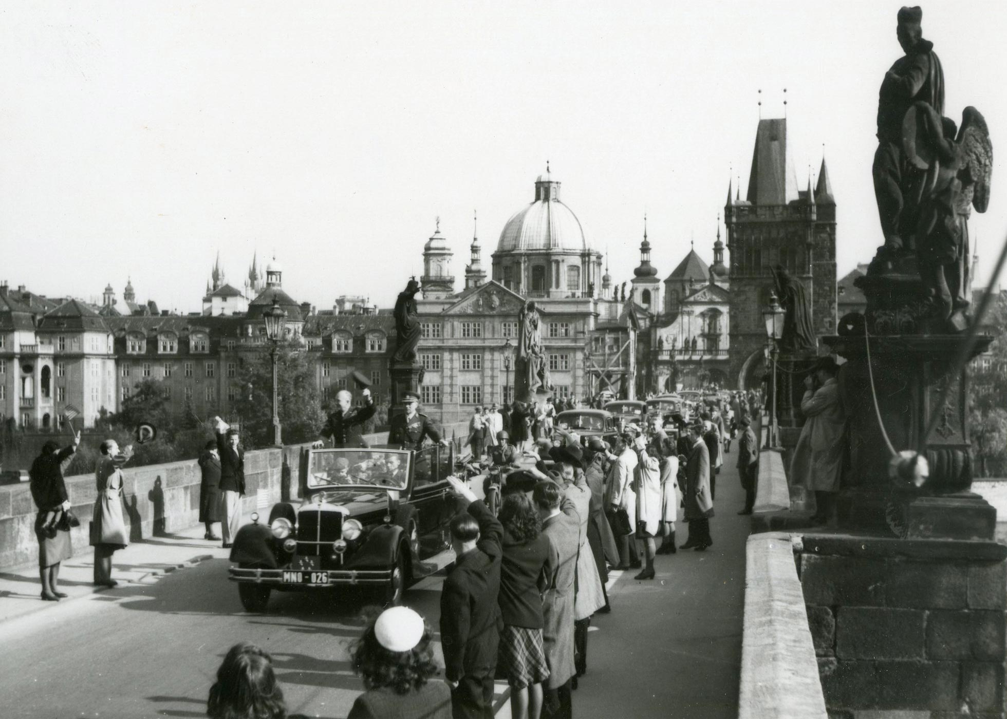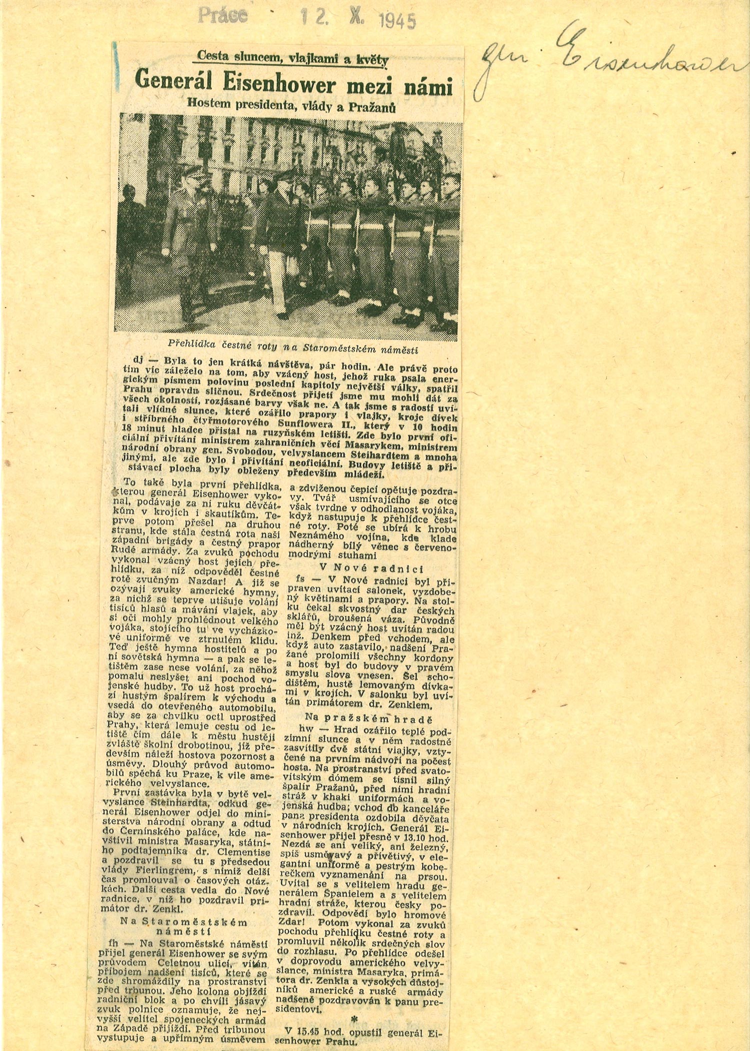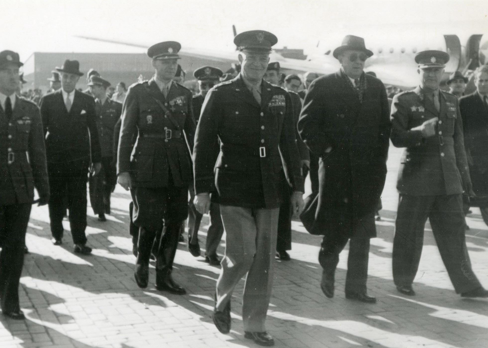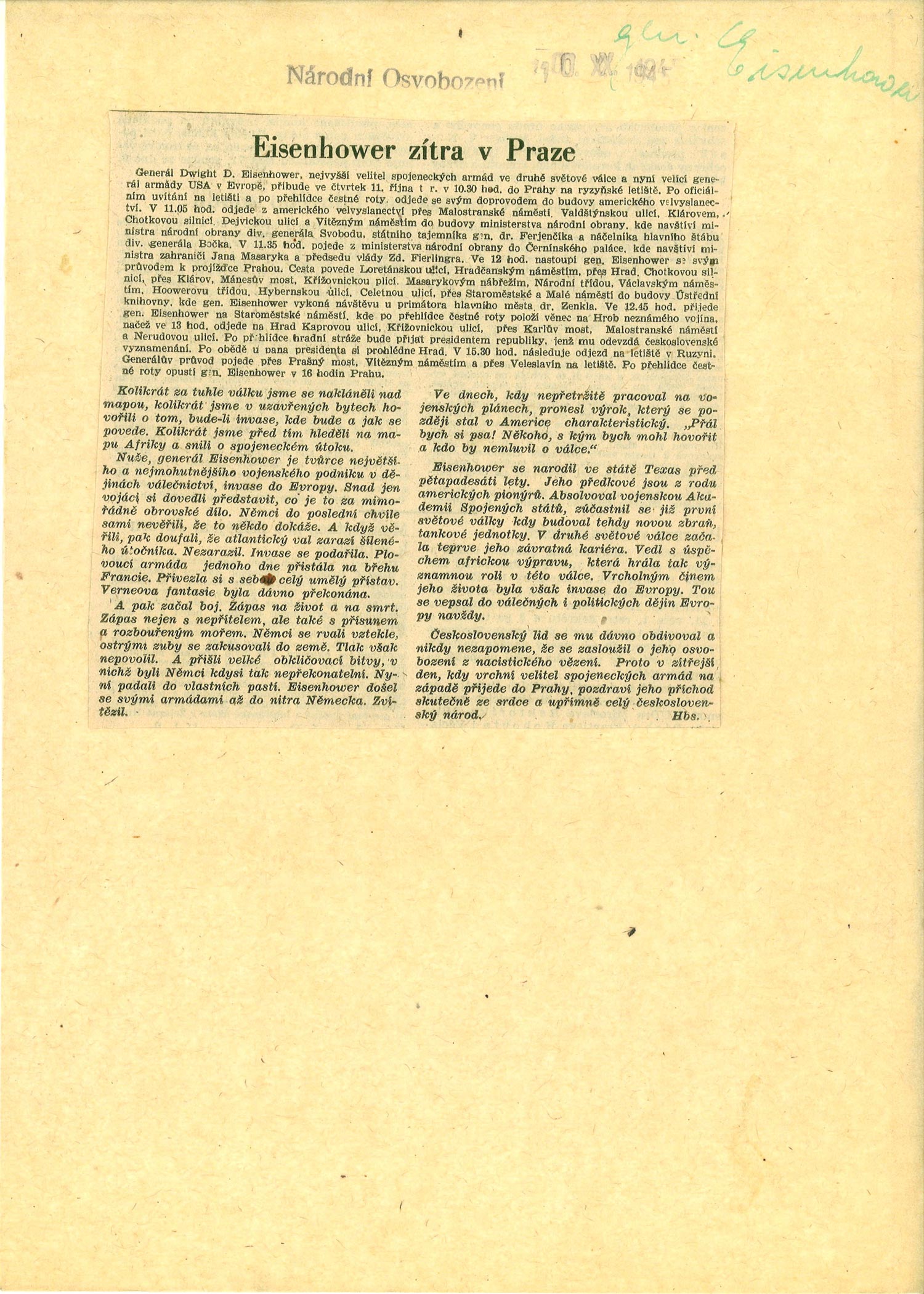 Fotografie z příletu D. D. Eisenhowera do Prahy na ruzyňské letiště, mj. v doprovodu ministra zahraničí J. Masaryka a generálů B. Bočka a L. Svobody, a z průjezdu městem.