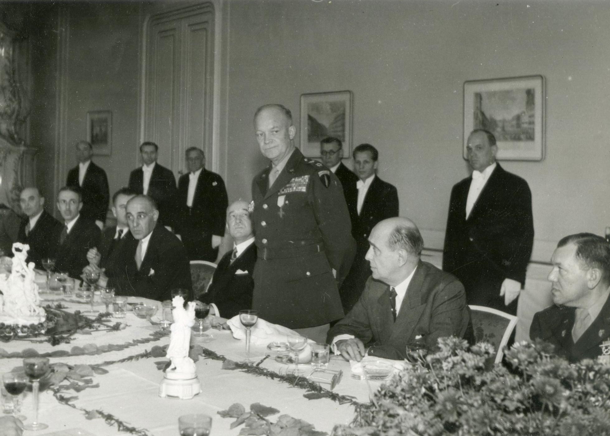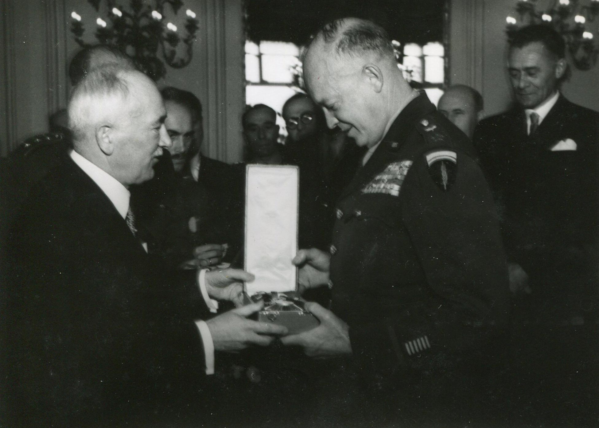 Prezident E. Beneš vyznamenává generála Eisenhowera Zlatou hvězdou řádu Bílého lva a Československým válečným křížem, s proslovem generála Eisenhowera při obědě v Trůnním sále.