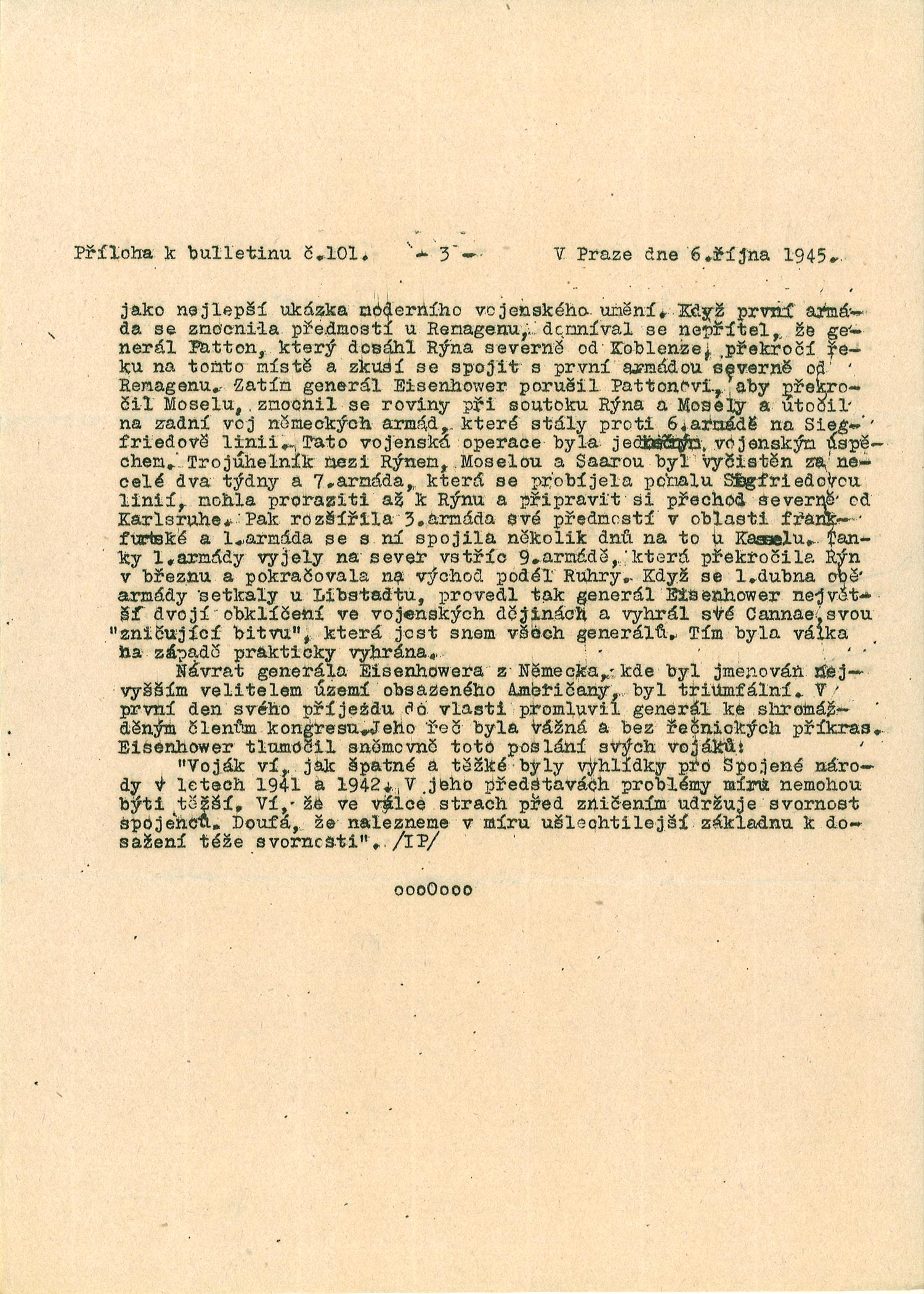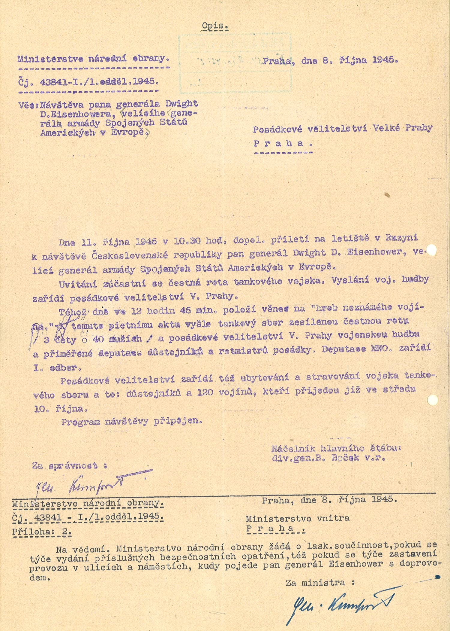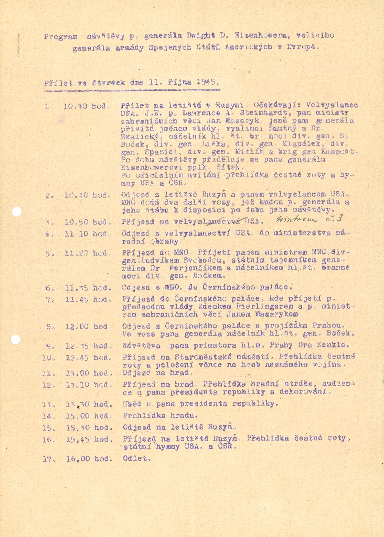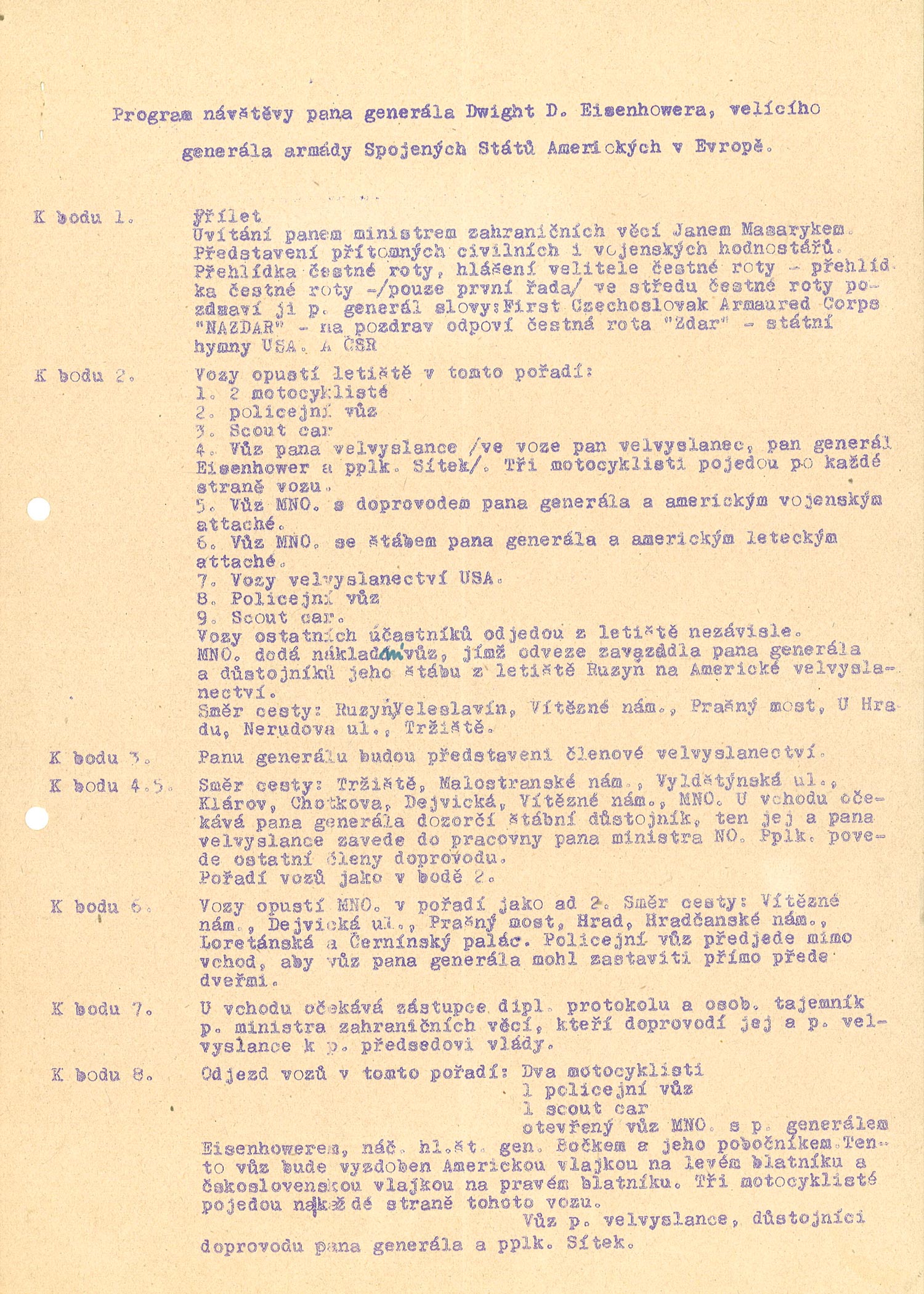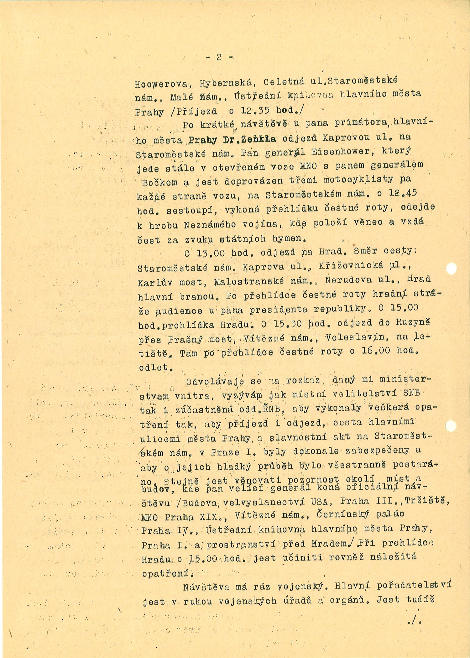 Žádost Ministerstva národní obrany o součinnost Ministerstva vnitra (prostřednictvím Posádkového velitelství Velké Prahy) při návštěvě generála D. D. Eisenhowera a jeho doprovodu v Praze (přiložen program návštěvy).
