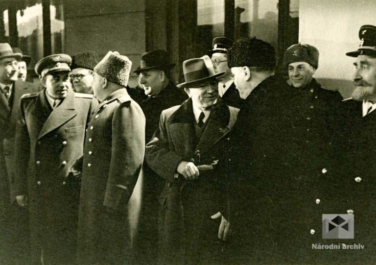 Snímek prezidenta republiky Edvarda Beneše (uprostřed), předsedy Státní rady Prokopa Maxy (vlevo) a státního ministra v Ministerstvu zahraničních věcí Huberta Ripky (vpravo) po prezidentově návratu z Moskvy, kde 12. prosince 1943 podepsal spojeneckou smlouvu mezi ČSR a SSSR, 1944, 6. leden, Londýn, NA, SR-L, kart. 8