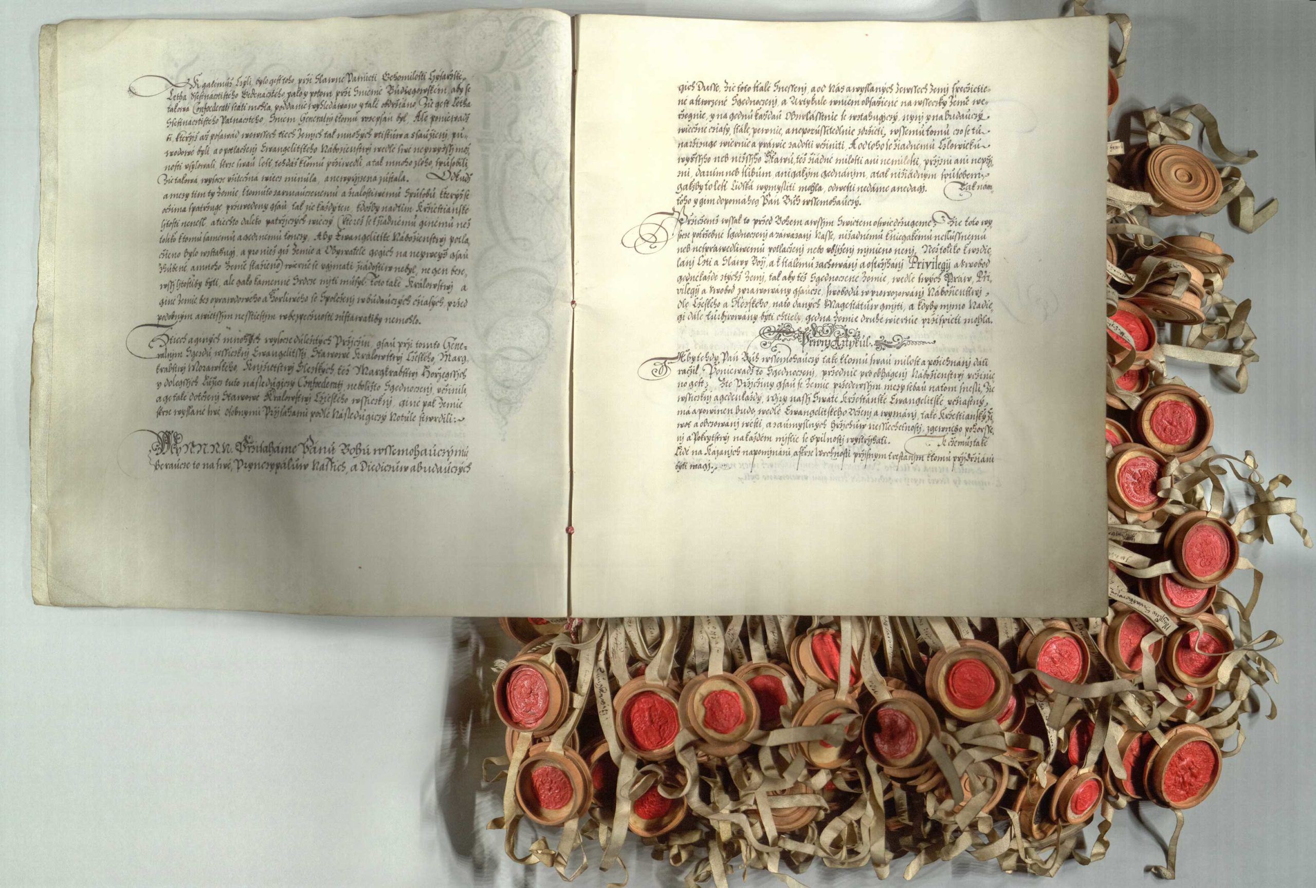 Zástupci stavů zemí České koruny přijímají novou společnou ústavu českého státu, který se stává konfederací, 1619, 31. červenec, Pražský hrad, NA, AČK, inv. č. 2328 (2. český exemplář)